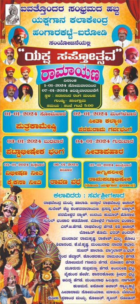 ಯಕ್ಷಗಾನ ಕಲಾಕೇಂದ್ರ ಹಂಗಾರಕಟ್ಟೆ-ಐರೋಡಿ ಇವರ ಸಂಯೋಜನೆಯಲ್ಲಿ ಸದಾನಂದ ರಂಗಮಂಟಪ ಗುಂಡ್ಮಿ-ಸಾಲಿಗ್ರಾಮದಲ್ಲಿ ಜನವರಿ 1 ರಿಂದ 7ರವರೆಗೆ ಯಕ್ಷ ಸಪ್ತೋತ್ಸವ ರಾಮಾಯಣ ಪ್ರತಿದಿನ ಸಂಜೆ 5ರಿಂದ