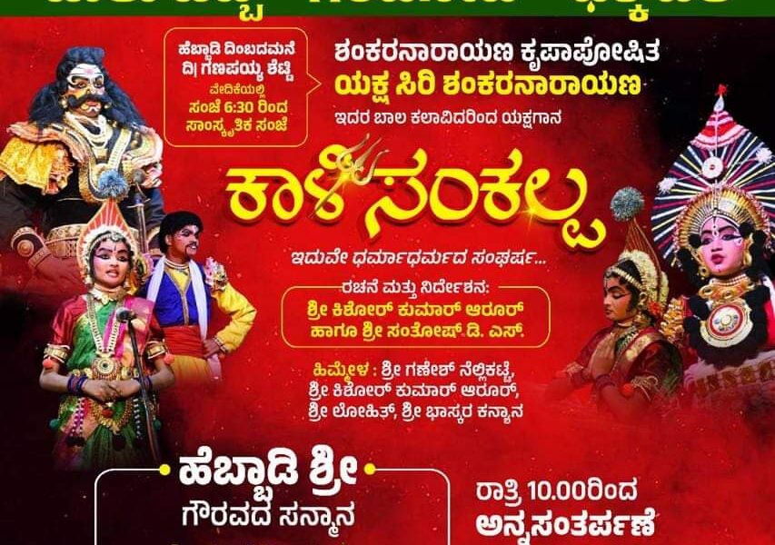 ಶ್ರೀ ನಂದಿಕೇಶ್ವರ ದೈವಸ್ಥಾನ ಹೆಬ್ಬಾಡಿ ಶಂಕರನಾರಾಯಣ ಇಲ್ಲಿನ ವಾರ್ಷಿಕ ಹಾಲು ಹಬ್ಬದ ಪ್ರಯುಕ್ತ ಶಂಕರನಾರಾಯಣ ಕೃಪಾಪೋಷಿತ ಯಕ್ಷ ಸಿರಿ ಶಂಕರನಾರಾಯಣ ಇದರ ಬಾಲ ಕಲಾವಿದರಿಂದ ಕಾಳಿ ಸಂಕಲ್ಪ ಯಕ್ಷಗಾನ ಕಾರ್ಯಕ್ರಮ ಮತ್ತು ಸಾಂಸ್ಕೃತಿಕ ಸಂಜೆ.