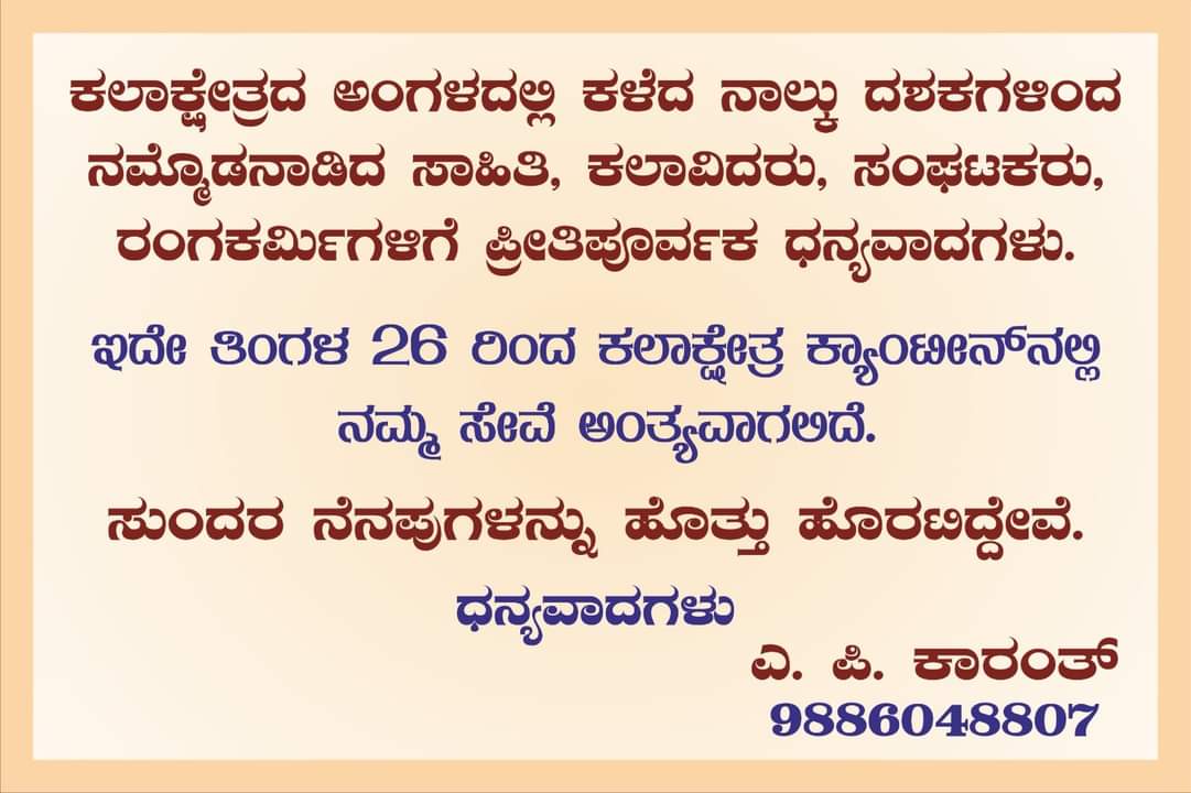 ಕಲಾಕ್ಷೇತ್ರದ ಕಾರಂತರ ಕ್ಯಾಂಟೀನ್ ಇನ್ನು ನೆನಪು ಮಾತ್ರ!